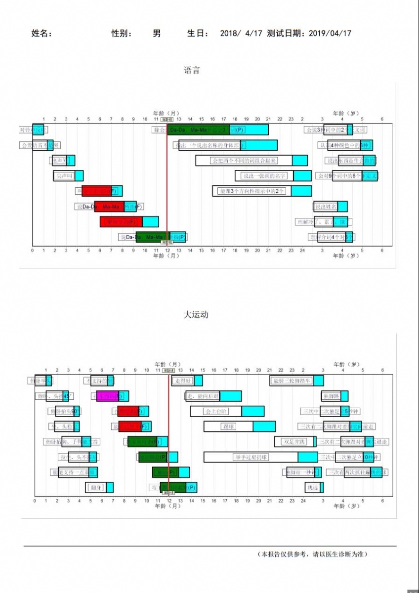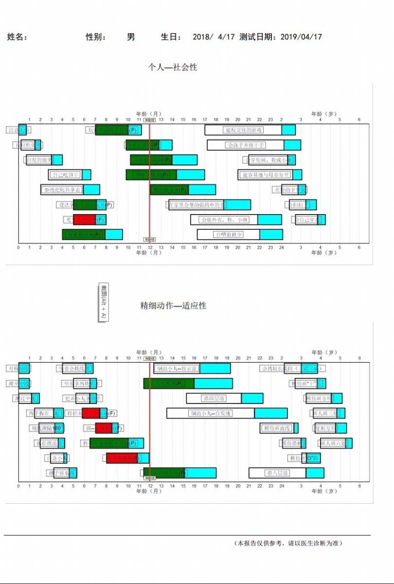 2、按照完成每個項(xiàng)目人數(shù)的25%、50%、75% 和90%作為標(biāo)準(zhǔn),將被查兒童與常模相比較,初步了解兒童的發(fā)育狀況。例如在某個年齡階段,90%的兒童都能掌握某項(xiàng)技能,而某被查兒童卻不能掌握,這一測驗(yàn)結(jié)果表明該兒童在這方面的發(fā)展可能遲滯。通過一系列項(xiàng)目的測驗(yàn),丹佛發(fā)育篩查測驗(yàn)?zāi)芴峁┰S多關(guān)于兒童心理發(fā)展?fàn)顩r的有價值的信息。
